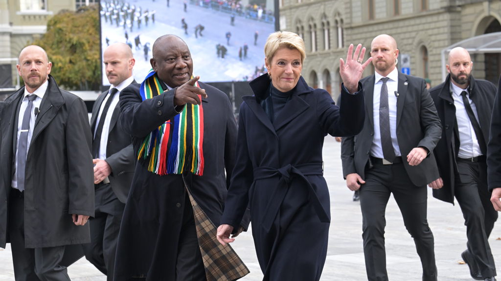 Der Bundesplatz wurde für den Empfang vorbereitet und zeigt sich von seiner schönsten Seite: Der rote Teppich ist ausgerollt, die südafrikanischen und Schweizer Fahnen wehen im Wind, und die Militärfanfare steht bereit. Bundespräsidentin Karin Keller-Sutter empfängt Ramaphosa und stellt ihn ihren Kolleginnen und Kollegen des Bundesrats vor. Es folgen militärische Ehren und die Nationalhymnen beider Länder. Die Stimmung bleibt festlich und friedlich.